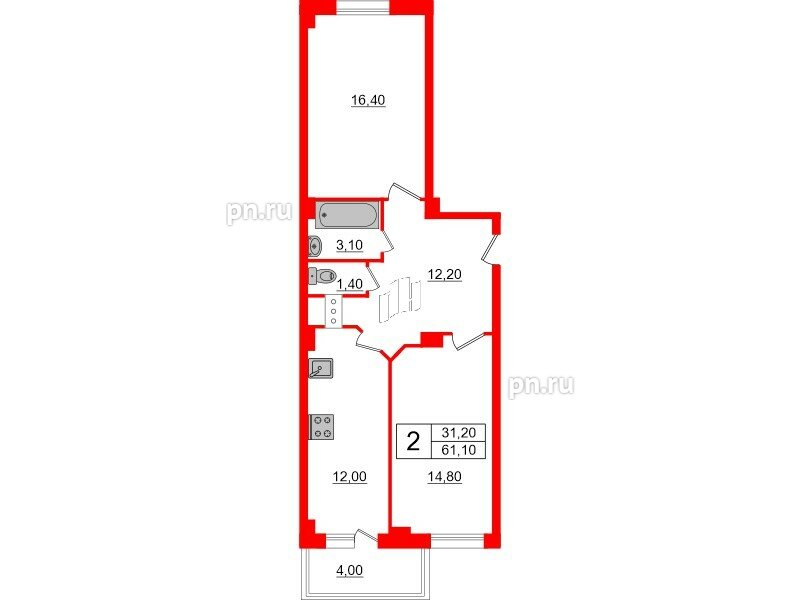 Общая площадь - 61.1 кв.м