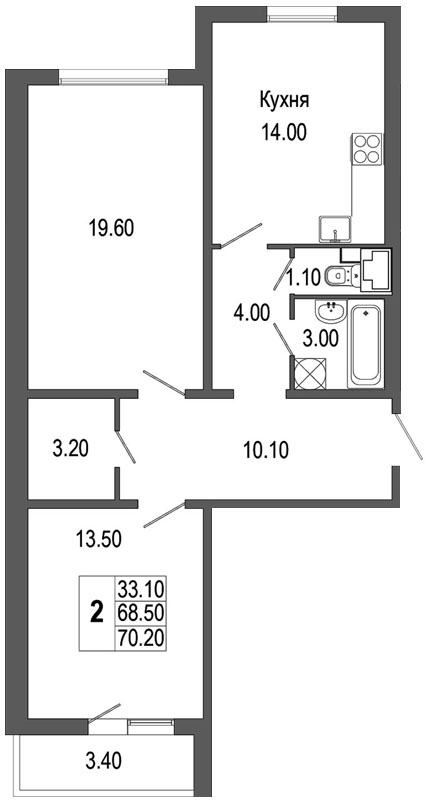 Жилая - 33.1 кв.м, Кухня - 14 кв.м