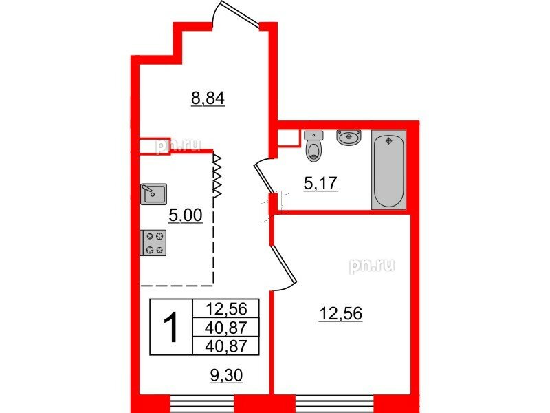 Жилая - 12.56 кв.м, Кухня - 14.3 кв.м