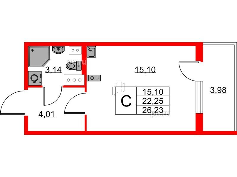 Общая площадь - 22.25 кв.м