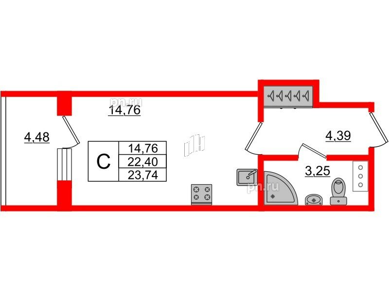 Общая площадь - 23.74 кв.м