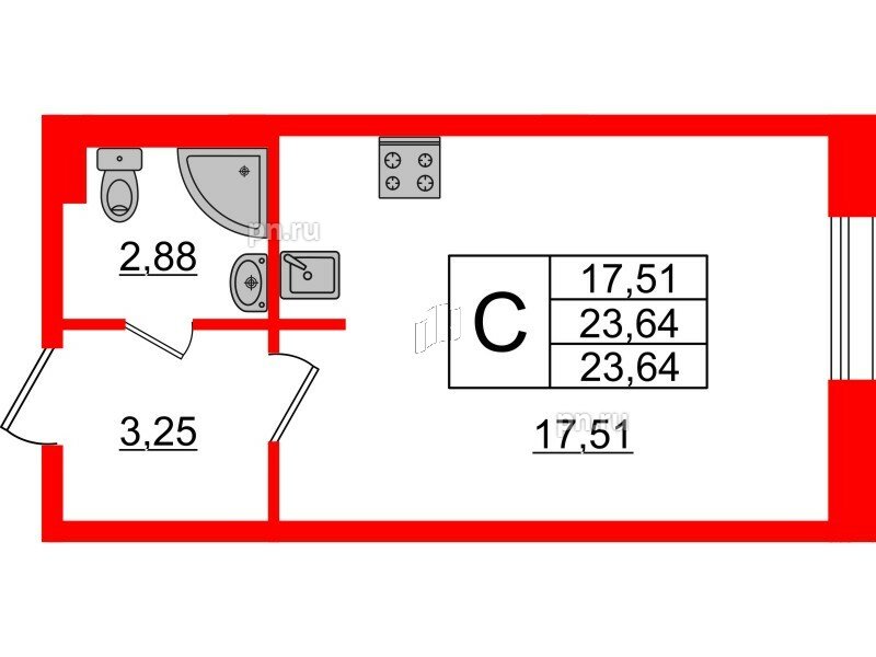 Общая площадь - 23.64 кв.м