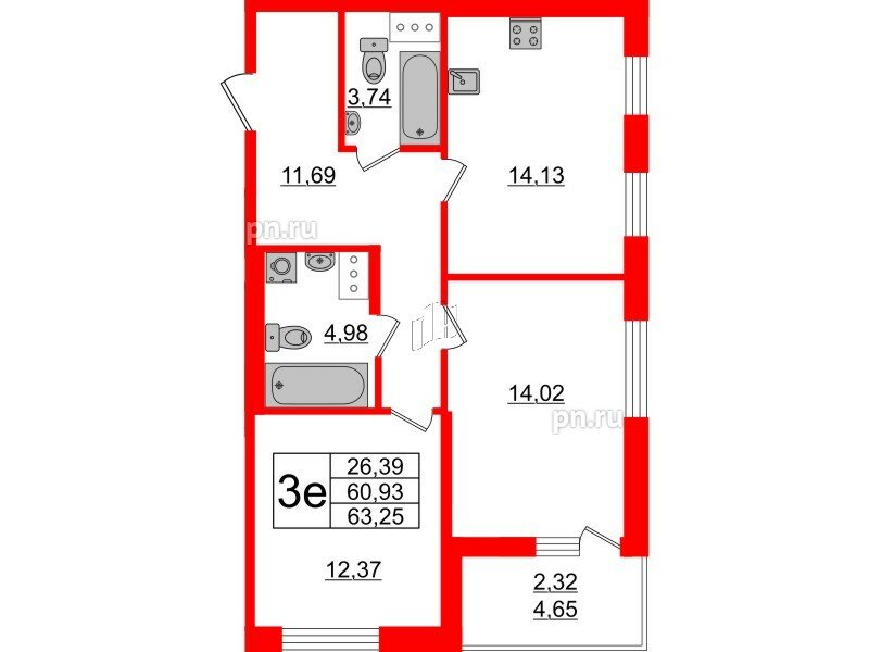 Жилая - 26.39 кв.м, Кухня - 14.13 кв.м
