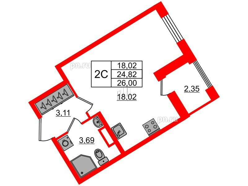 Общая площадь - 24.82 кв.м