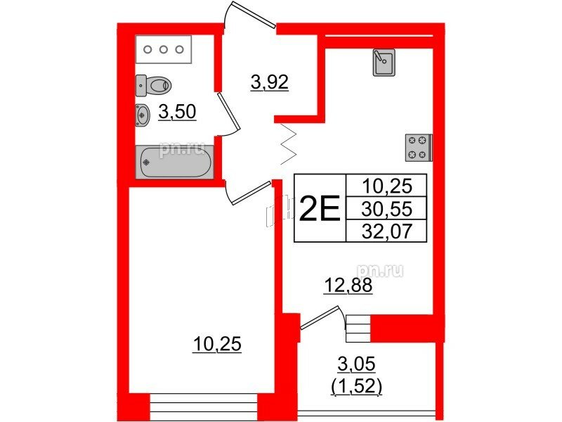 Жилая - 10.25 кв.м, Кухня - 12.88 кв.м