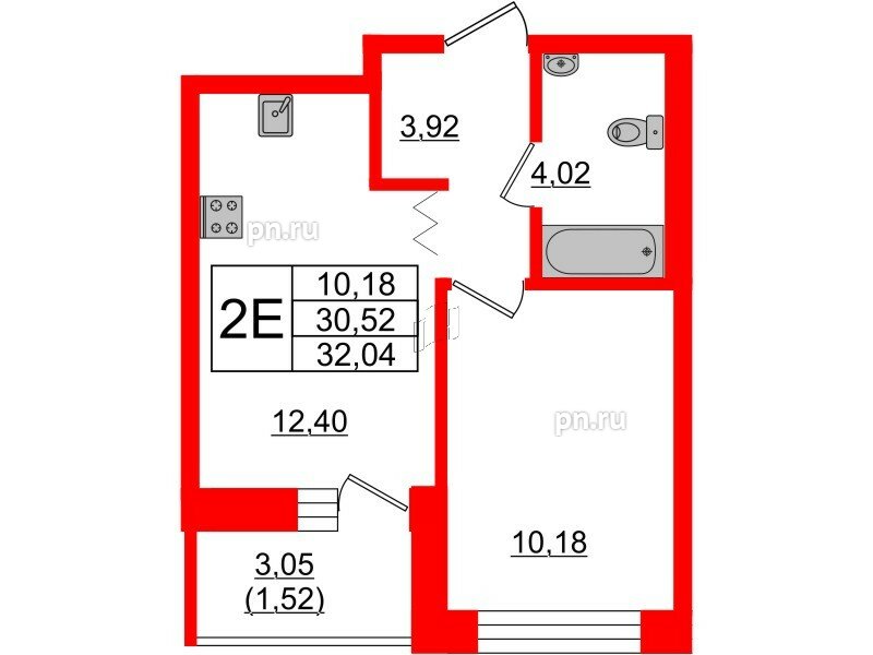 Жилая - 10.18 кв.м, Кухня - 12.4 кв.м