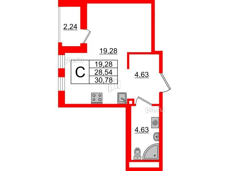 Общая площадь - 28.54 кв.м