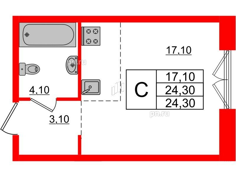 Общая площадь - 24.3 кв.м