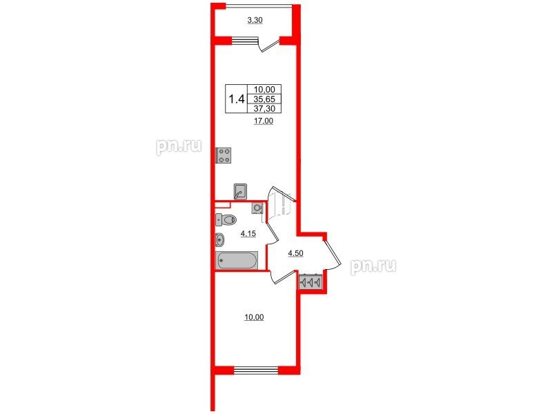 Общая площадь - 35.65 кв.м