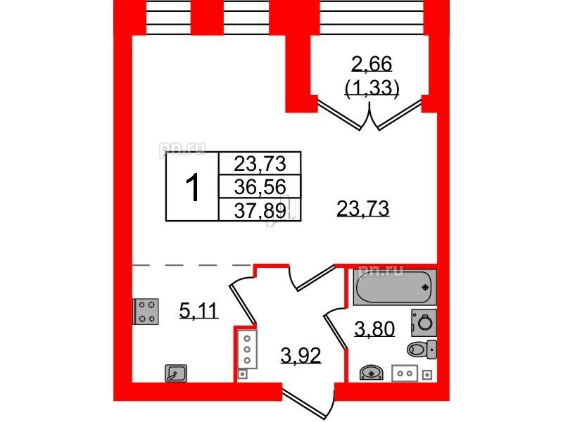 Жилая - 23.73 кв.м, Кухня - 5.11 кв.м