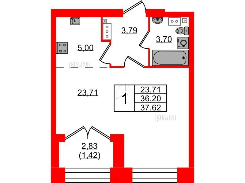 Общая площадь - 37.62 кв.м