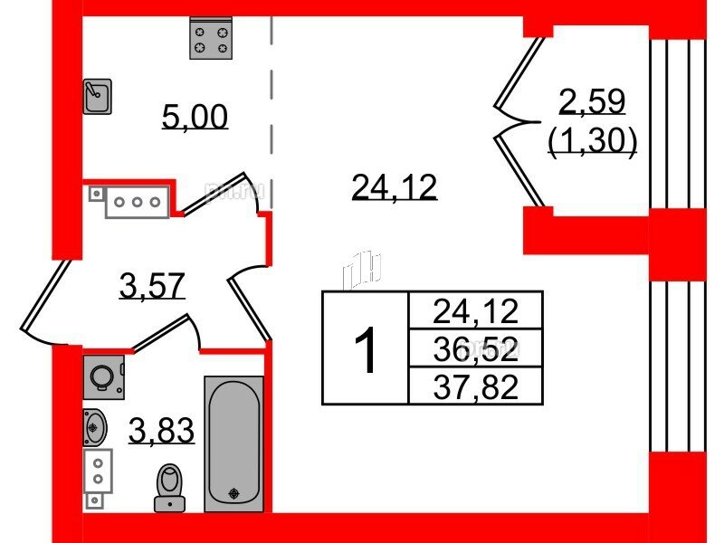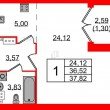 Жилая - 24.12 кв.м, Кухня - 5 кв.м
