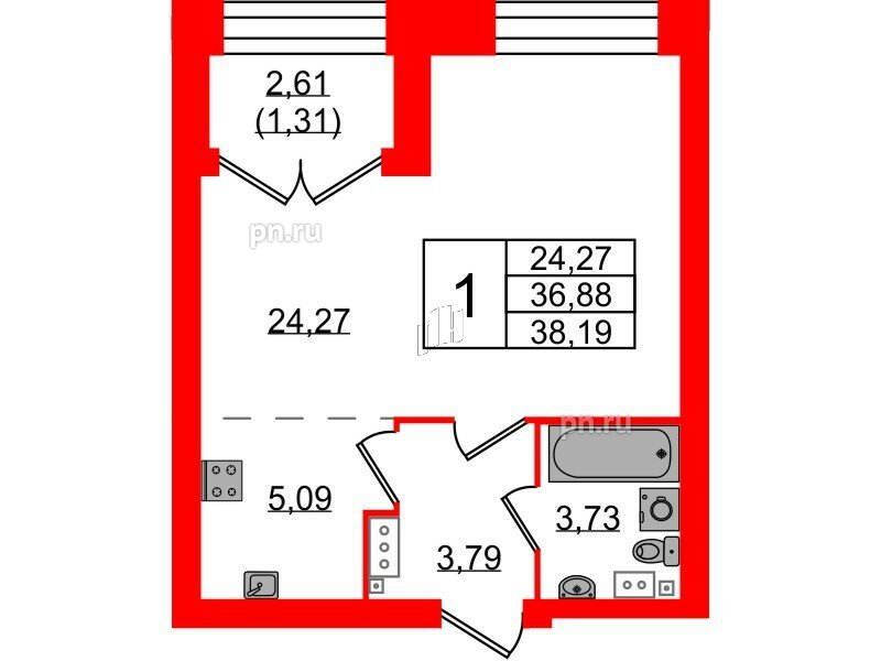 Жилая - 24.27 кв.м, Кухня - 5.09 кв.м