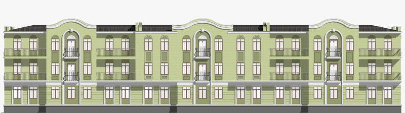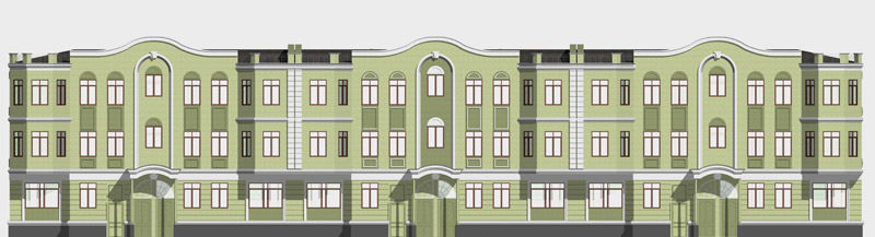 В стиле «Модерн» выполнены полукруглые балконы, огражденные коваными решетками и фигурные элементы в верхней части фасада, так называемые ризалиты. Так же характерным элементом этого стиля является и обрамление окон.