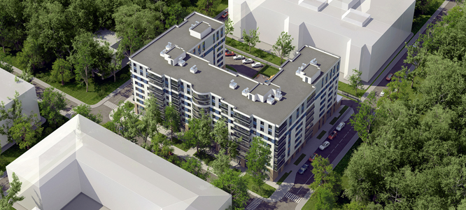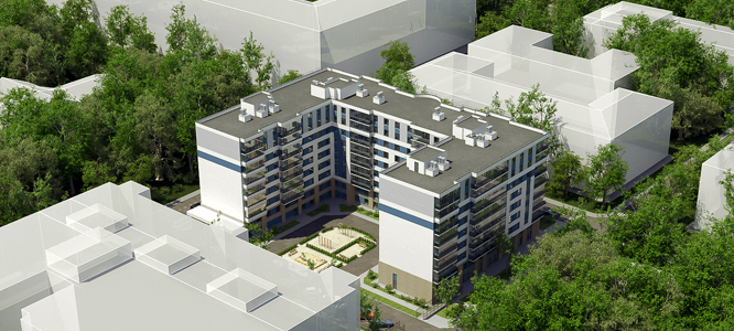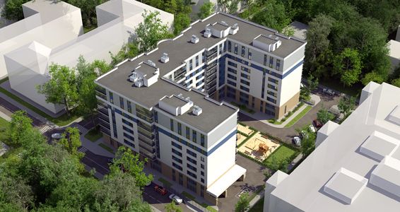 9-этажное здание с 1-4-комнатными квартирами.