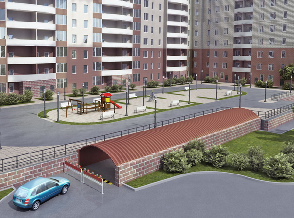 Комплексное благоустройство прилегающей к дому территории - озеленение, малые архитектурные формы, устройство детской площадки, зоны отдыха, общая пешеходная система