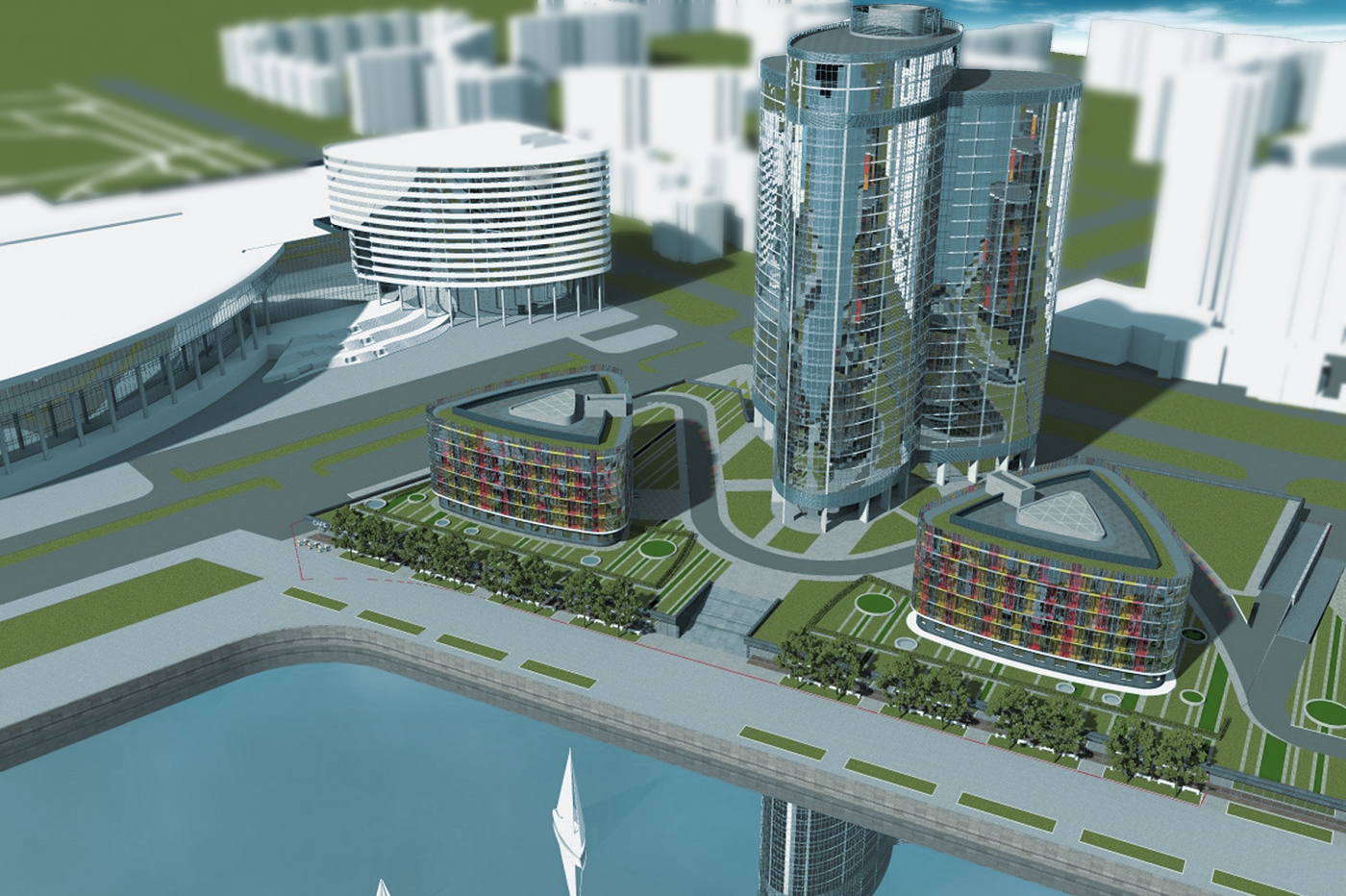 Первые уровни зданий займут фитнес-клуб с крытым бассейном, сауна, SPA-центр, конференц-залы и уютный ресторан.