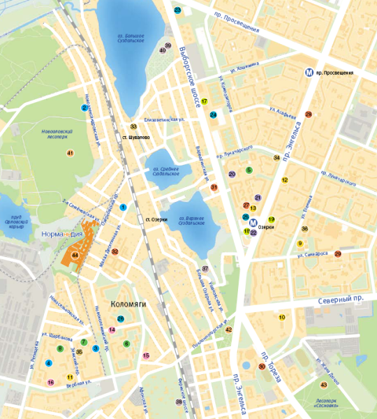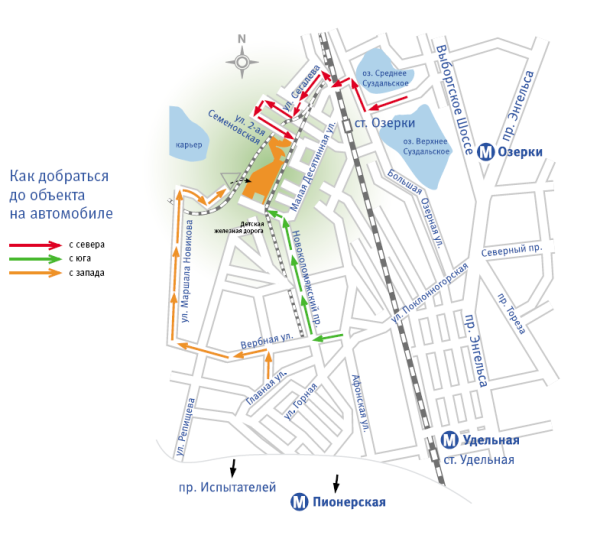 Метро «Озерки», «Пионерская», «Удельная» (15 мин. на авто)