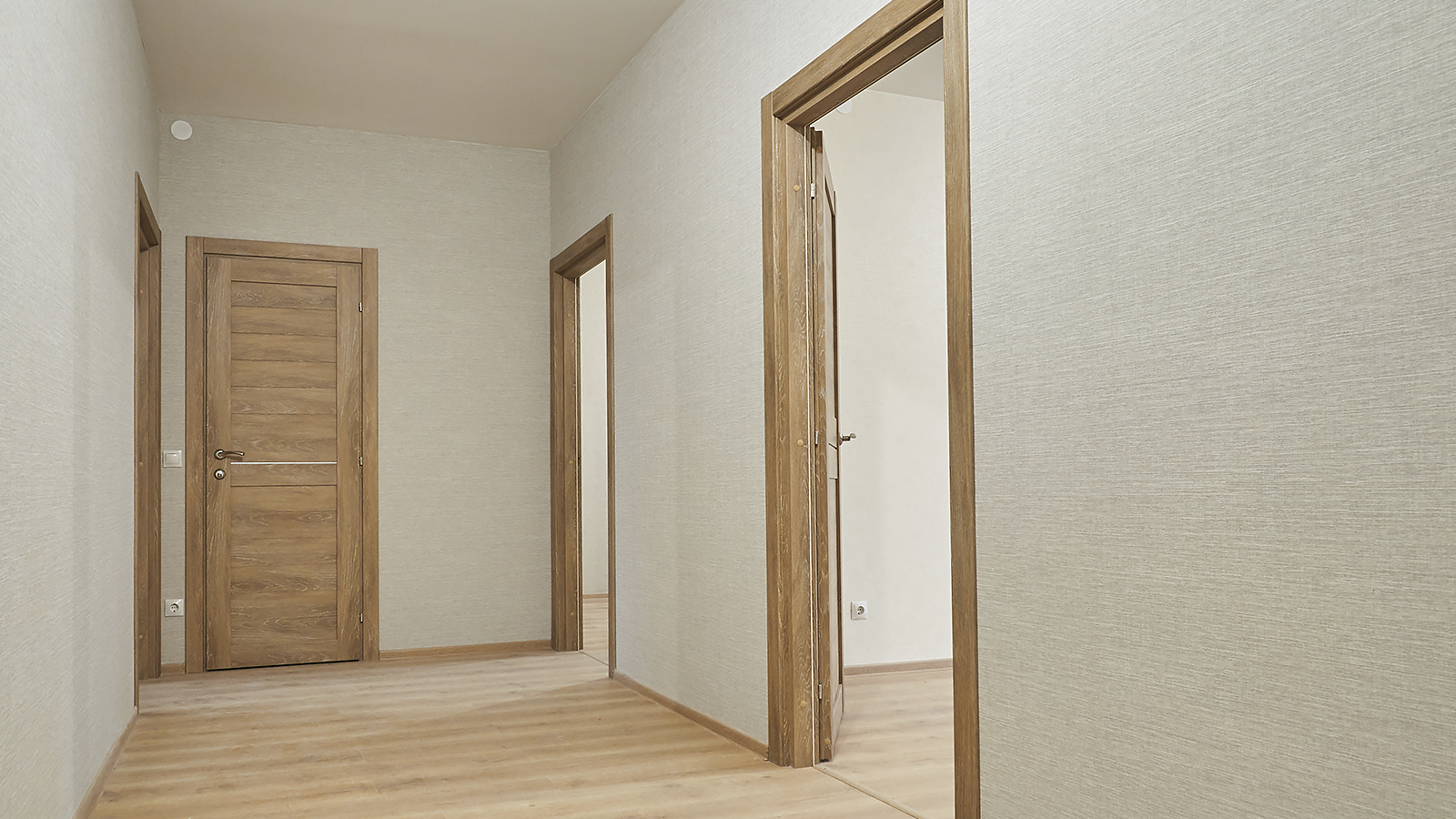 стены в комнатах, на кухне и коридорах оклеены обоями светлых тонов;
