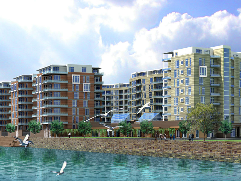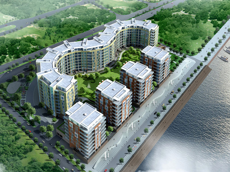 Вдоль берега реки планируется расположить несколько жилых районов. Данный проект расположен ближе всего к 3-ему Елагинскому мосту. Вдоль планируемой набережной будет также предусмотрено помещение для предприятий сферы обслуживания, таких как рестораны, кафе, небольшие специализированные магазины и т. д. Территория застройки удобно расположена по отношению к транспортным коммуникациям.