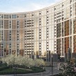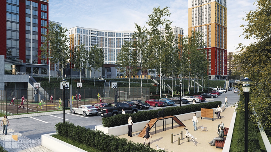 Внутренний двор закрыт для входа посторонних. Во-первых, он располагается на стилобате, что приподнимает его почти на 6 м над соседними территориями. Это исключает проникновение посторонних в принципе. Во-вторых, попасть в подъезды жилых домов можно только со стилобата, поднявшись на специальном лифте (вход по электронному ключу), или пройдя через одну из входных групп с зоной ресепшн.