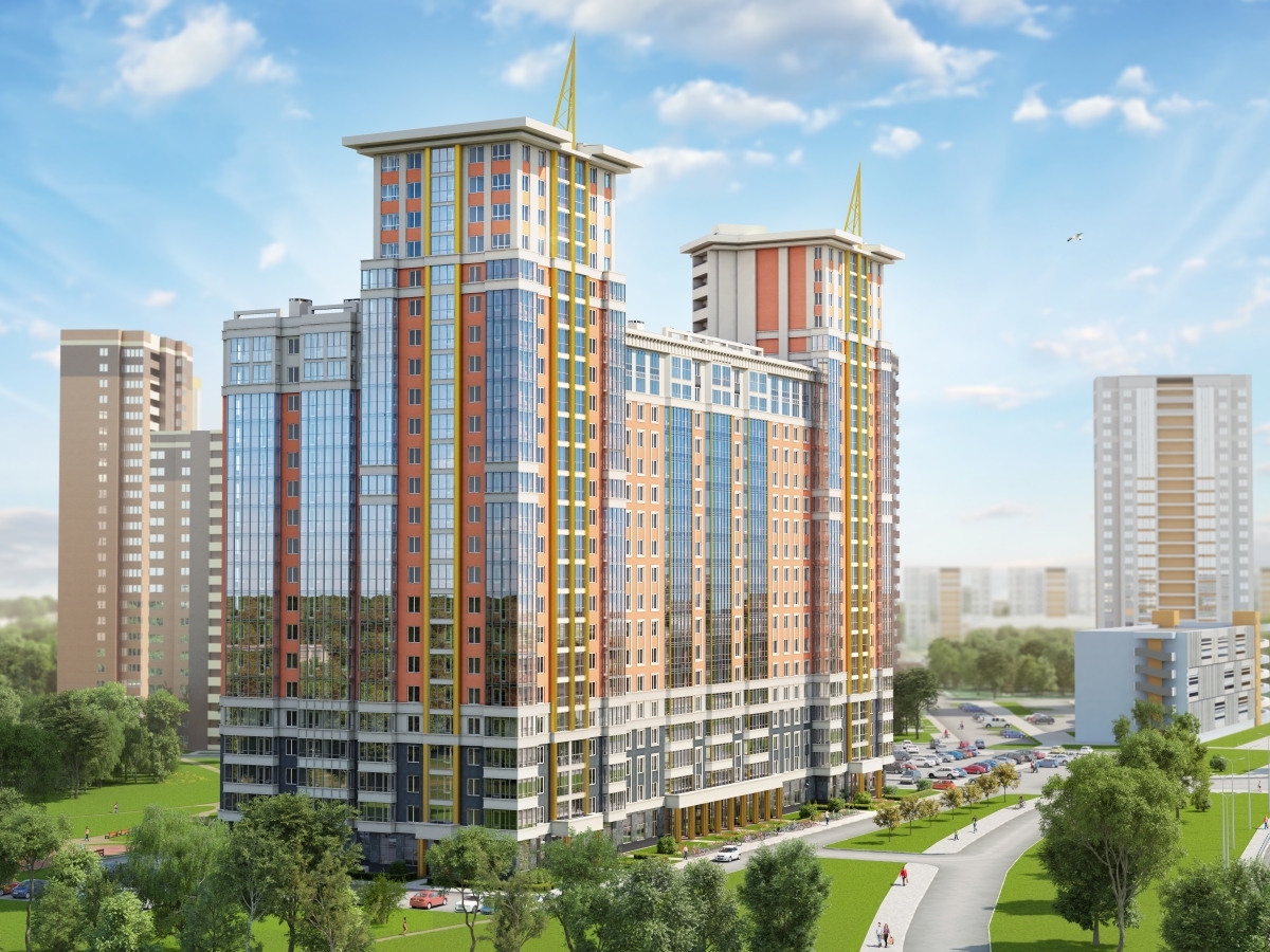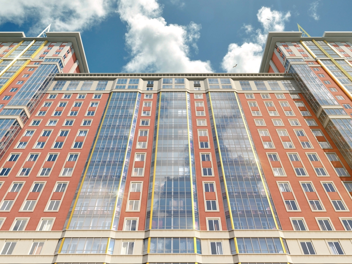 Высота здания — 18 этажей, башен — 24 этажа. Дом строится по современной монолитной технологии, для цветового оформления фасадов выбраны натуральные оттенки.