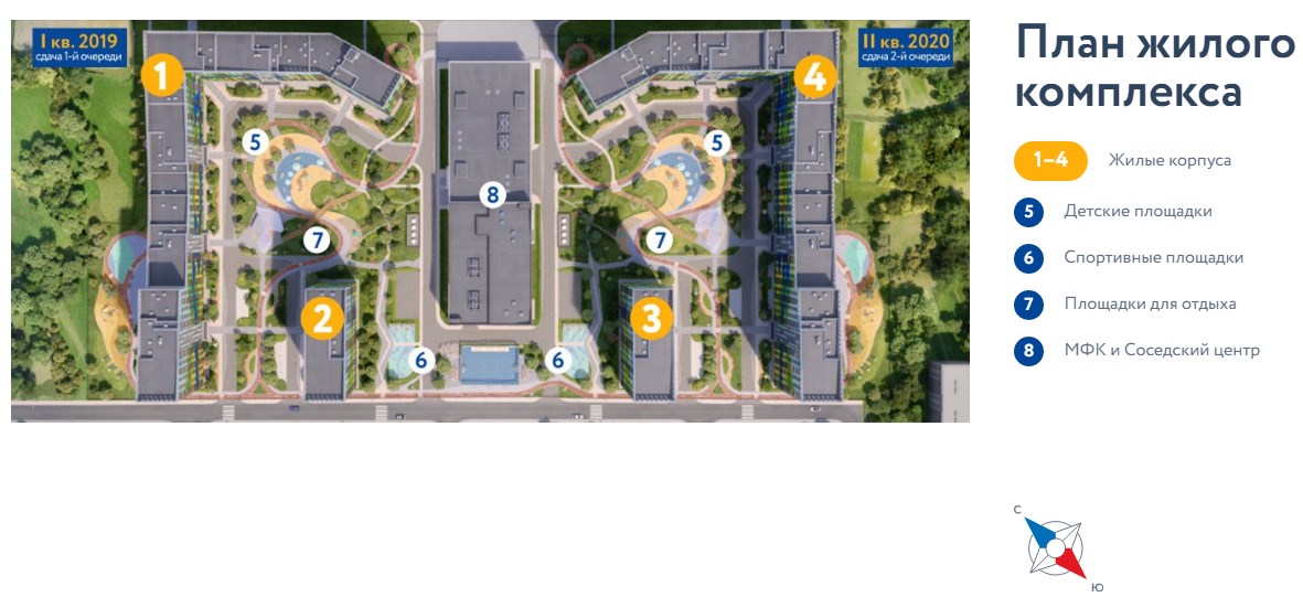 Расположение, конструктивные особенности и переменная высотность (от 14 до 24 этажей) корпусов обеспечивают высокий уровень инсоляции как дворов, спортивных и игровых площадок и пропускных зон, так и помещений жилого комплекса.
