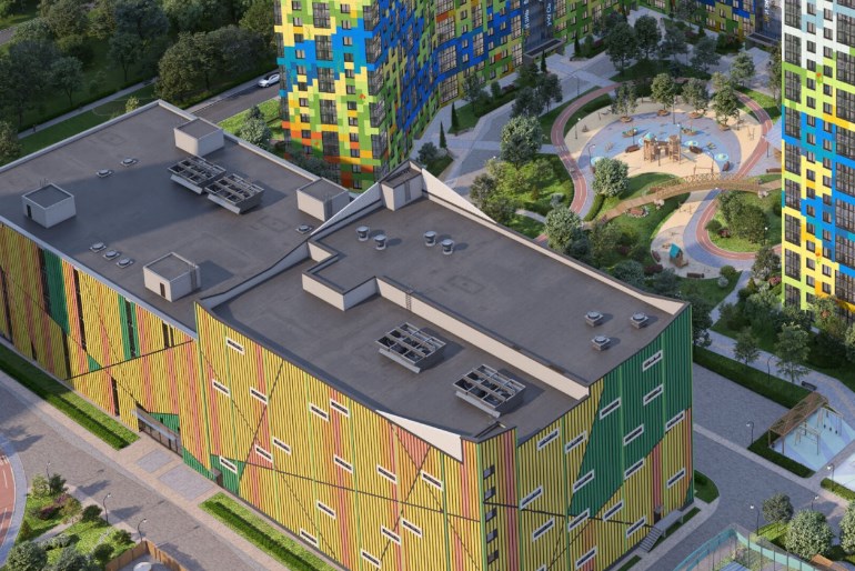 Центром общественно‐деловой жизни жилого комплекса станет собственный многоэтажный торговый центр, где разместятся кафе, магазины, различные коммерческие и общественно‐деловые объекты.
