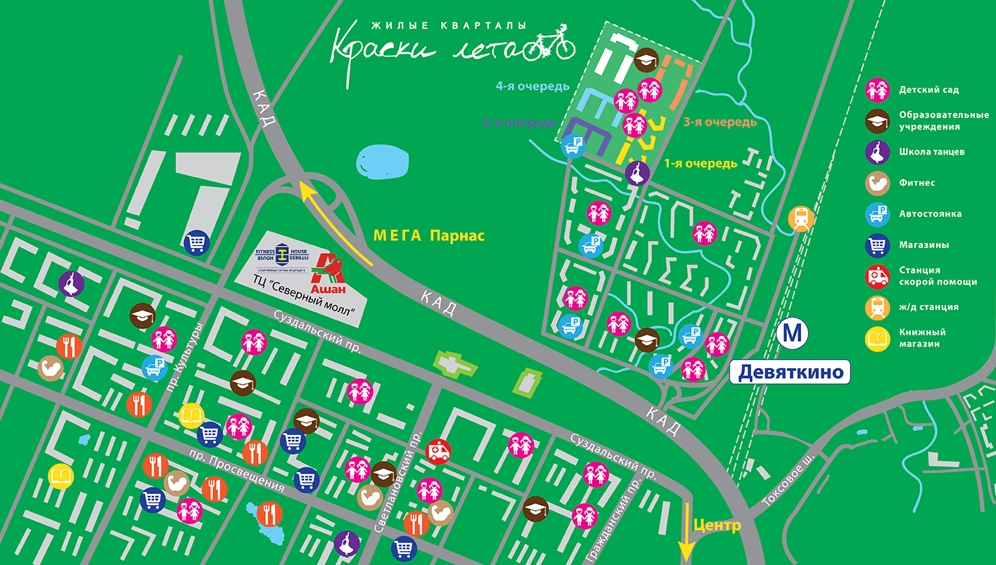 Здесь есть все необходимое для жизни: государственные и частные детские сады, школы, продуктовые супермаркеты, аптеки, банки. Развлекательная инфраструктура представлена крупными ТРК - «МЕГА Парнас» и «Северный молл», ресторанами и кафе. Круглый год для посетителей открыт аква-парк «Родео Драйв». До популярных мест отдыха петербуржцев - горнолыжных курортов «Охта Парк» и «Северный склон», Кавголовских озер и озера Хелоярви – около получаса езды.