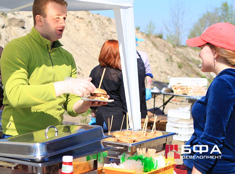 Приятный бонус трудящимся: полезная и вкусная еда, фотосессия, музыка, развлечения для детей + футболки с фирменной символикой, банданы и флажки.