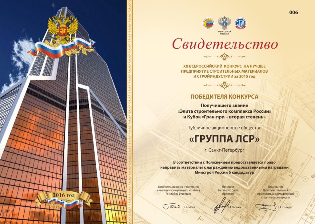 Компания неоднократно принимала участие в данном конкурсе и каждый раз получала высокую оценку своей деятельности со стороны профессионального сообщества. В этом году очередное достижение: «Группе ЛСР» присвоили почётное звание «Элита строительного комплекса России» и удостоили Кубка «Гран-при — второй степени». Напомним, что на протяжении нескольких лет подряд компанию награждали дипломом I степени «За достижение высокой эффективности и конкурентоспособности в строительстве и промышленности строительных материалов».