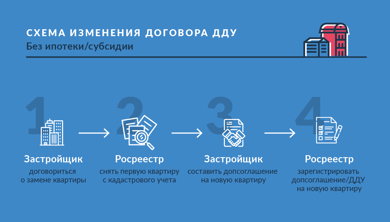 Если сделка прошла без привлечения ипотечного займа, материнского капитала или других льгот-субсидий, все решается на уровне договоренностей с застройщиком,. Необходимо снять квартиру с государственного кадастрового учета, прекратив право собственности, и зарегистрировать новую, а также составить дополнительное соглашение.