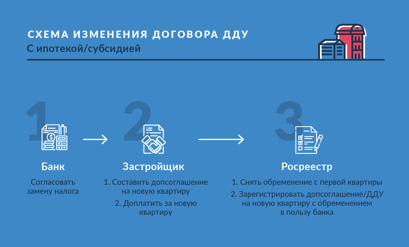 «Если квартира приобретена с использованием средств ипотеки или субсидиями, то необходимо согласовать с банком замену залога. Можно заключить дополнительное соглашение или расторгнуть текущий ДДУ и заключить новый. При этом если стоимость новой квартиры будет больше, то доплата возможна только за счёт личных средств».