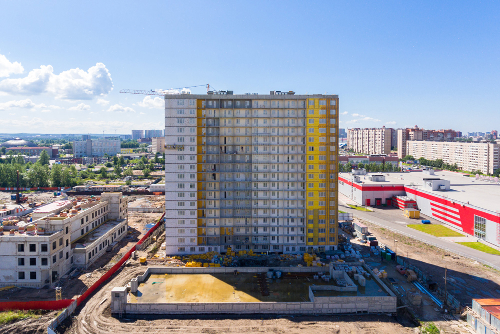 В настоящее время закончено возведение монолитного каркаса здания, наружных стен и перегородок, выполнено остекление окон, заканчивается работы на кровле. Ведется устройство вентилируемого фасада: поверх утеплителя монтируются стекломагнезитовые листы, по которым устанавливается керамогранитная плитка. Внутри дома продолжается прокладка инженерных сетей и отделка квартир. Строители закончили прокладку теплотрассы для подключения дома к системе централизованного отопления. Подрядчики заканчивают устройство сетей водопровода и канализации. Завершаются работы по возведению подземного паркинга.
