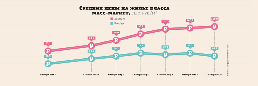 Традиционно спрос на квартиры в области поддерживался за счет низких цен. По данным «Петербургской недвижимости», сегодня это 68,2 тыс. против 108,8 тыс. рублей за 1 кв. м в классе масс—маркет. Однако последнее время в границах Санкт-Петербурга появились варианты с небольшим бюджетом покупки, например, Каменка, Парголово, пр. Маршала Блюхера на севере, Средняя Рогатка, Октябрьская наб., Дальневосточный пр., Ручьи, Ново—Сергиево на юге. Именно они, по сравнению с Ленобластью, и становятся более привлекательны на рынке жилья.