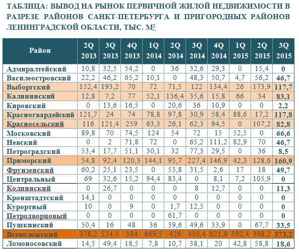 По данным центра аналитики ГК «Доверие», лидерами по выводу нового предложения в продажу (новые жилые комплексы, очереди и корпуса) являются Всеволожский, Выборгский, Красногвардейский и Приморский районы. В частности, во Всеволожском районе только по итогам 3-го квартала 2015 года появилось 373,2 кв.м. нового первичного жилья, что, в свою очередь, более чем в 2 раза превышает объемы вывода других районов-лидеров в Петербурге и Ленинградской области.