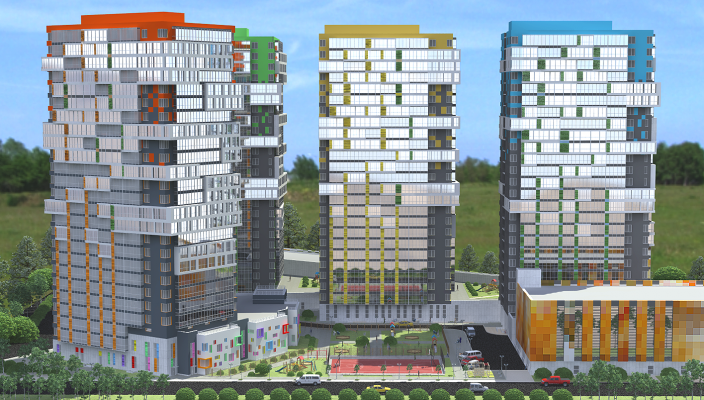 Холлы домов выполнены в той же цветовой гамме, что и фасады каждого из корпусов, а яркий и стильный внешний вид строений напоминает скорее жилые элитные постройки из футуристических голливудских фильмов, нежели пригородные дома Санкт-Петербурга.