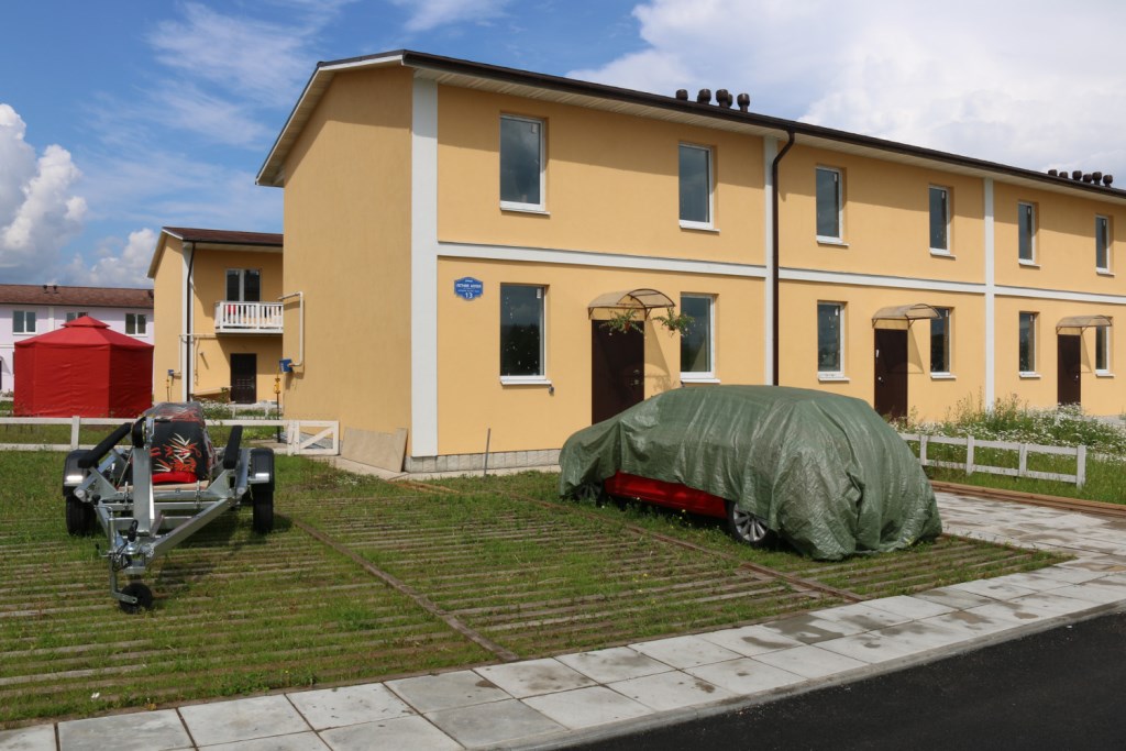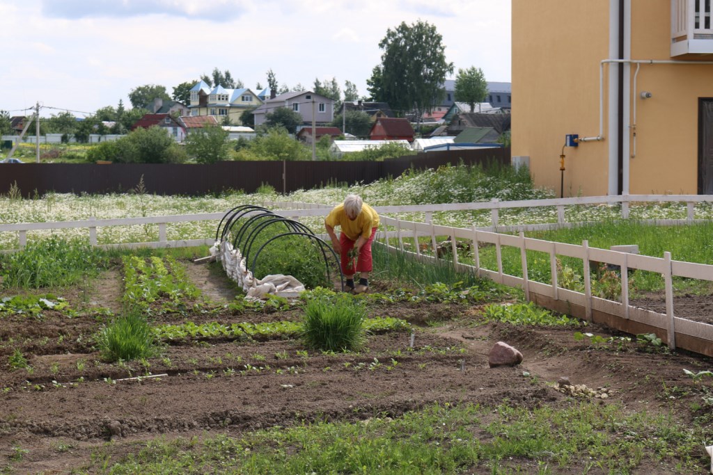 Мимо нескольких домов, в которых, судя по строительным материалам и шуму смесителя, вовсю идёт ремонт мы проходим к месту, выбивающемуся из общего ландшафта посёлка. «Один из собственников решил устроить рядом со своим домом сразу три парковочных места. Это, в отличие от гаражей, общим регламентом посёлка не запрещено. Одна из жительниц решила устроить на своём участке огород. По-соседски делится выращенным. У нас вообще соседи дружат, организуют совместные пикники».