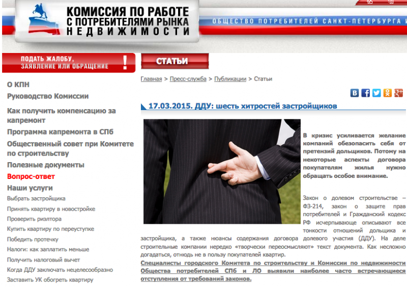 Правоохранителям не понравилась размещенная на сайте статья "ДДУ: шесть хитростей застройщиков". В публикации специалисты городского Комитета по строительству и Комиссии по недвижимости Общества потребителей СПб и ЛО рассказывают о том, как строители хитрят с договорами долевого участия и 214 ФЗ (Закон о долевом строительстве). Естественно, не в пользу покупателя.