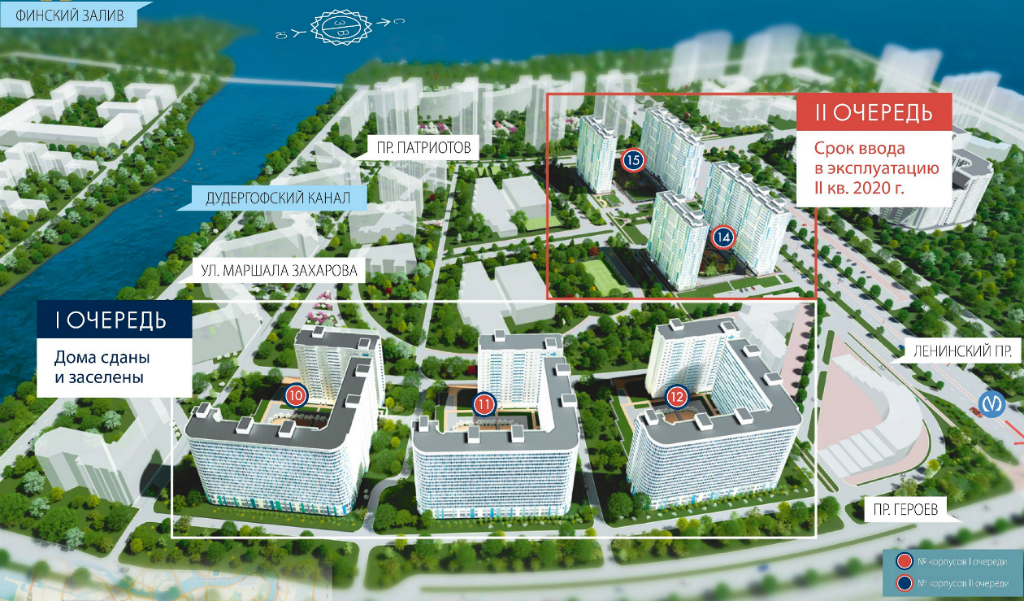 ЖК ОГНИ ЗАЛИВА – квартиры с полной отделкой в готовых и строящихся корпусах на берегу Финского залива и Дудергофского канала, в начале Ленинского проспекта, на пересечении с проспектом Героев, в 20 мин езды от метро «Ленинский проспект».