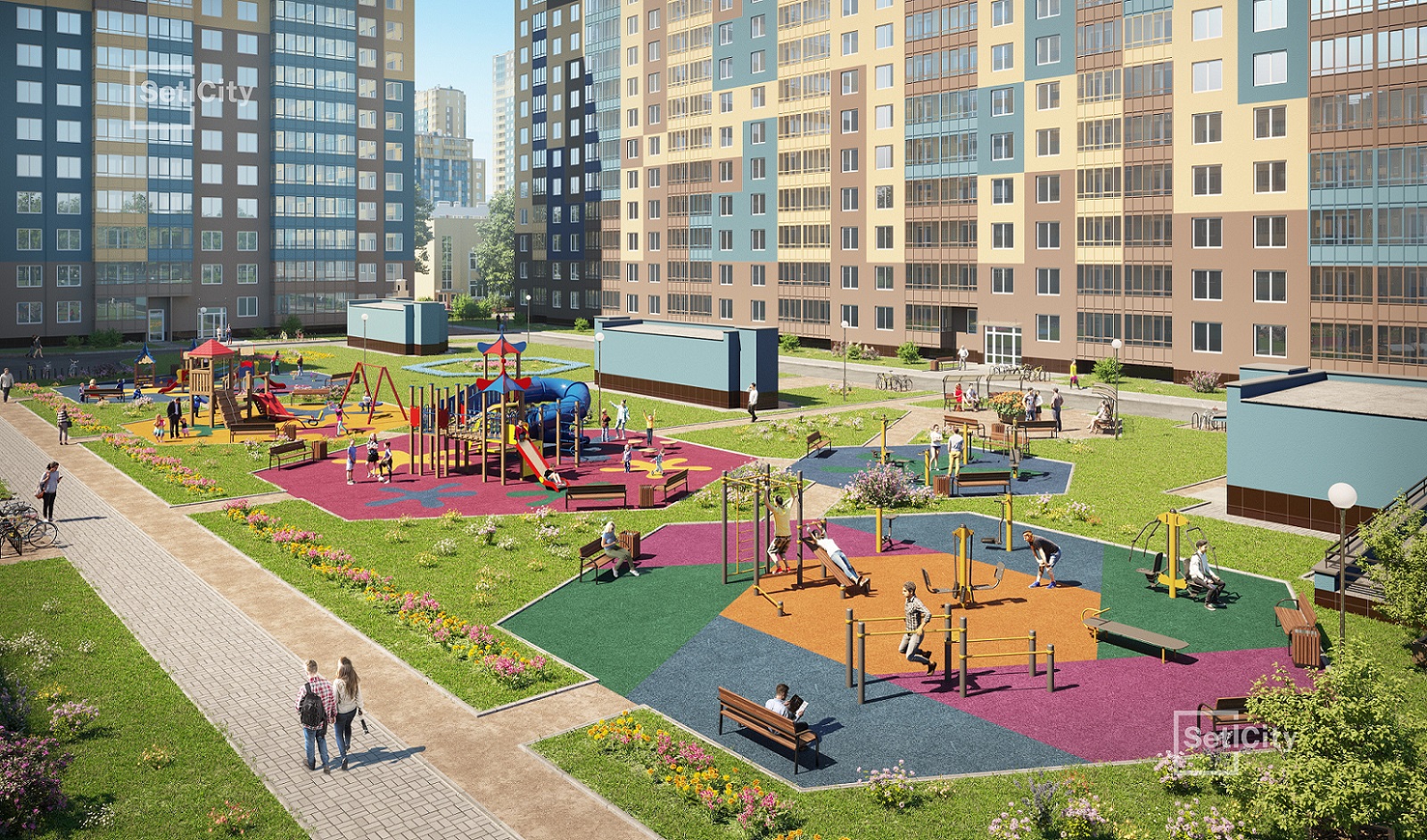 Двор нового корпуса полностью закрыт от машин: здесь появятся детские площадки с безопасным прорезиненным покрытием, спортивные площадки с уличными тренажерами и комфортные зоны отдыха. Для автомобилей предусмотрены два охраняемых подземных паркинга. Необходимая торгово-сервисная инфраструктура разместится на первом этаже дома.