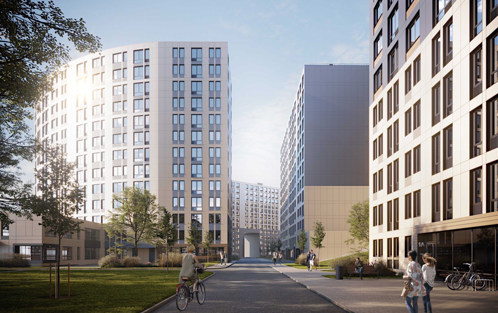 Внутреннеe пространство жилого комплекса NEW TIME благоустроят, оборудуют видеонаблюдением. В самих дворах, свободных от машин, появятся детские площадки и зоны со спортивным инвентарем – для активного времяпрепровождения, а также прогулочные дорожки и места для «тихого» отдыха. Кровлю наземного паркинга благоустроят и озеленят для отдыха жителей. В проекте предусмотрены велопарковки, а в каждой парадной организуют помещения для хранения колясок. Благоустроят и зону вокруг комплекса – вдоль фронта улицы появится променад с газонами, магазинами и разнообразной торгово-бытовой инфраструктурой.