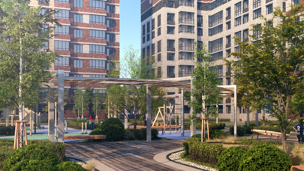 На первом этаже жилых домов разместятся встроенные коммерческие помещения, вход в которые предусмотрен со стороны улицы. Такое расположение общественных зон сделает внутренний двор безопасным пространством для жителей комплекса. Помимо детских, спортивных площадок и зон отдыха здесь появится горизонтальный (траверсный) скалодром для детей и взрослых, а также лужайка для занятий йогой.
