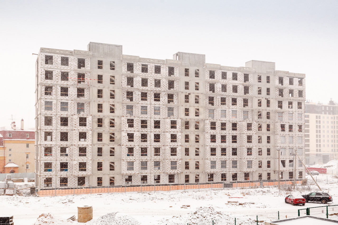 В 6 корпусе II очереди жилого комплекса «Английская миля»; от Glorax Development завершены работы по кладке наружных стен и продолжается устройство перегородок и внутренних стен.