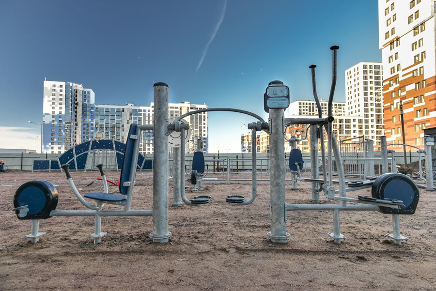 Кластер полностью укомплектован спортивными комплексами, тренажерами и другим оборудованием от одного из ведущих мировых производителей — Kompan. Площадки оснащаются травмобезопасным тартановым покрытием. Сейчас возведение объекта находится в финальной стадии.