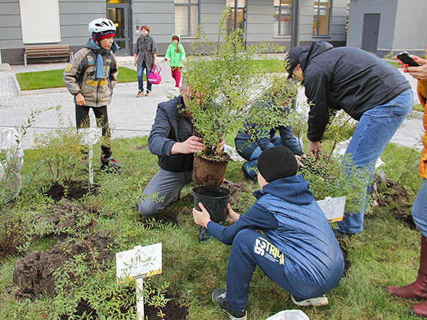 Уход за высаженными растениями, конечно, в первую очередь будет осуществлять управляющая компания, но и жители смогут принимать в этом участие — тем более, что у каждого кустика установлена табличка с фамилией «посаженных родителей».